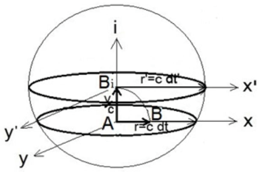 in fig. 3 represents the distance between observers A and B in RFA . As we did for a 2-D space-time, in order that both, A and B , have a constant distance from the spherical surface where the photons are distributed (that is to be both at the centre of the sphere), we must rotate