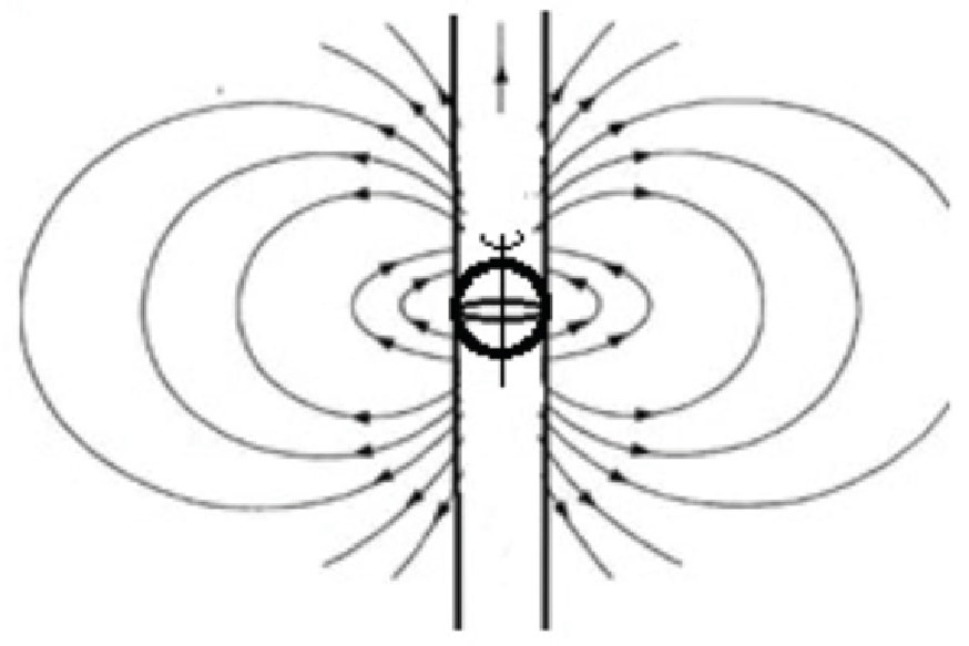 There is a fundamental difference, however. In a rotating mass not all the lines of flux can close on the opposite pole. In fact, one of the lines generated by each elementary particle of the mass is necessarily parallel to the axis of rotation. Therefore there is a "bundle" of lines of flux that never close to the opposite pole, as they extend in space ad infinitum, never diverging from each other.
