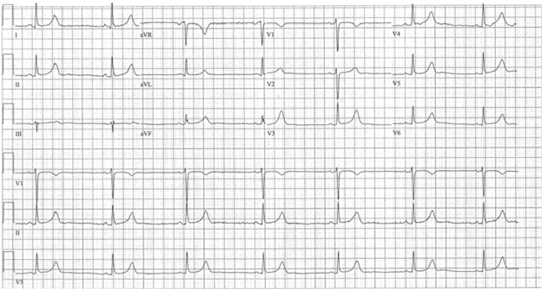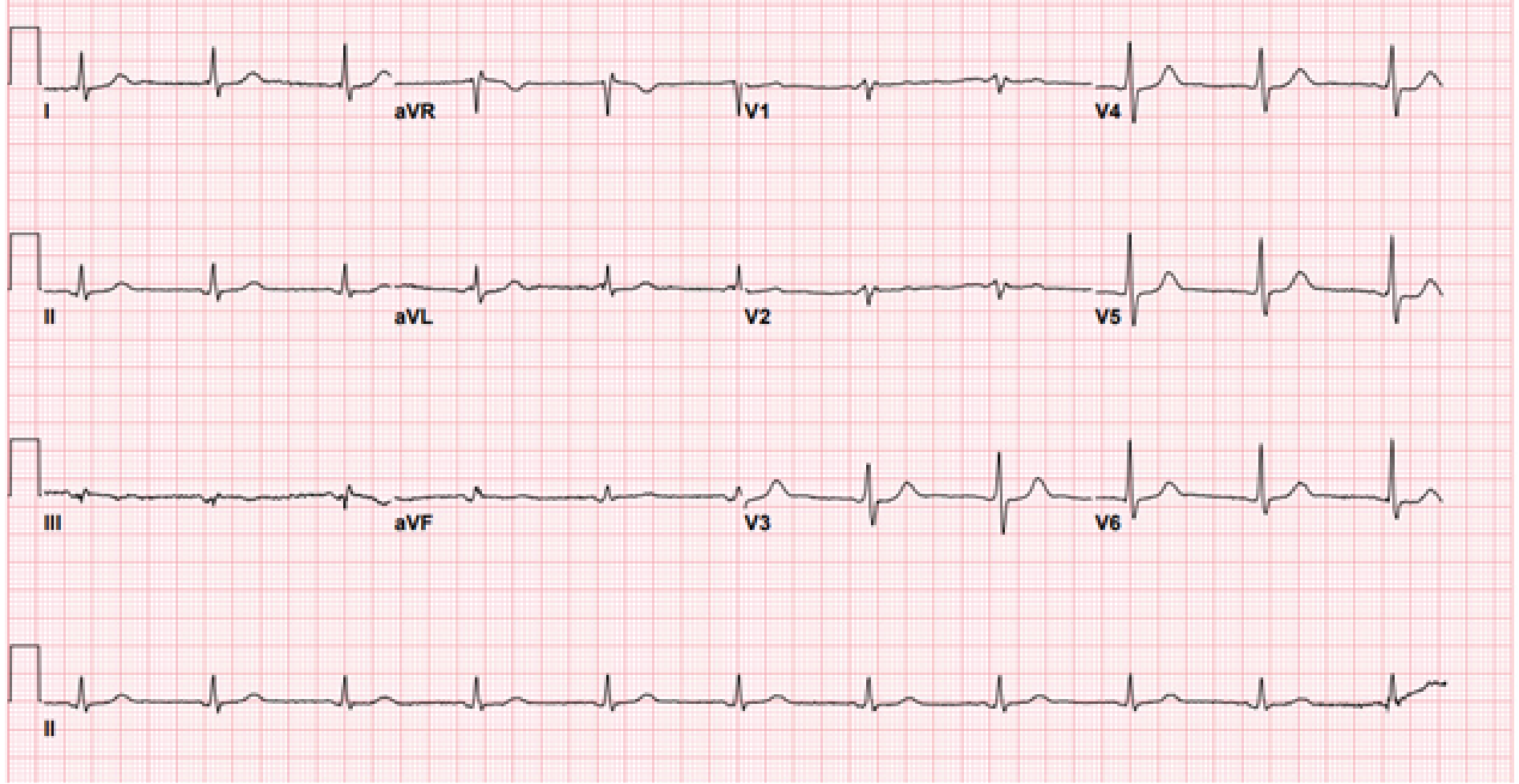 Figure 1: Patient’s initial electrocardiogram with significant bradycardia (40 beats per minute present)