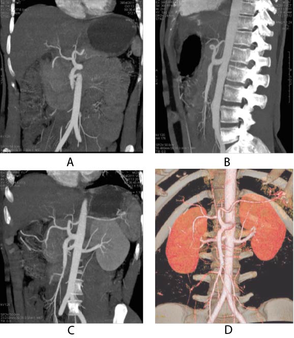 Figure 1. (A and B) Coronal and Sagittal reformatted CT angiogram shows common origin of celiac and superior mesenteric artery (|Common celiacomesenteric trunk) (C and D) Coronal reformatted CT renal angiogram with 3D colored projections shows normal renal arteries and celiacomesenteric trunk.