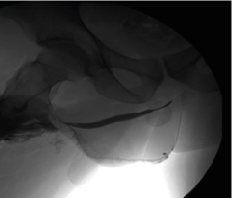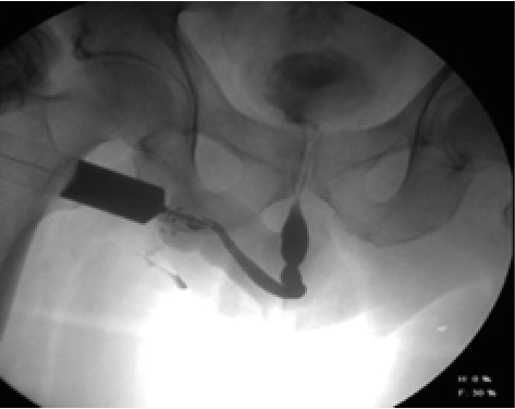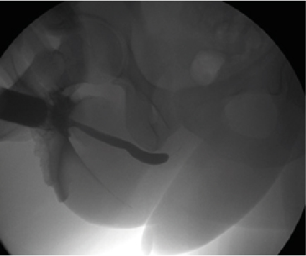 Figure 8:The study of choice if we want to evaluate the real stenosis of the prostatic urethra is cystiscopia and voiding cystography, since in this image the contrast step is adequately identified in the entire urethra, previously diagnosed by retrograde urethrography as prostatic stenosis