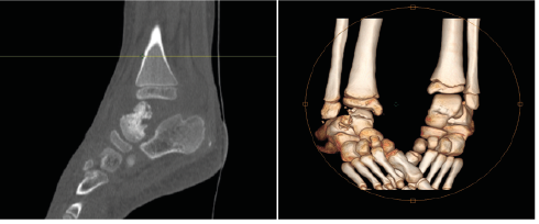 An ankle CT scan is performed urgently and revealed osteoarthritis collected from the right ankle with multiple sequesters of the astragalus (Figure 2).
