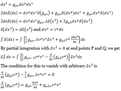A geodesic that is not a null geodesic has the property that ∫ds, taken along a section of the track with the end points P and Q, is stationary if one makes a small variation of the track keeping the end points fixed. If dx µ denotes an element along the track [20]