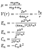 In the hydrogen atom an electron is orbiting a nucleus with 1 proton, we know the energy levels from the solution of the Schrödinger's equation [4], where mp is the proton mass, me is the electron mass, μ is the 2 -body reduced mass, e is the electron charge, r is the position of the electron relative to the nucleus, the potential term is due to the Coulomb interaction wherein ϵo is the permittivity of free space.