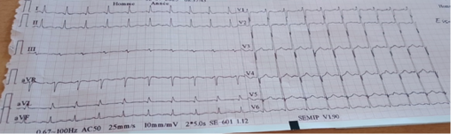 Myocardial contusion is a potential complication of cardiac trauma [1]. Its incidence varies greatly due to its clinical polymorphism and the frequent presence of associated lesions that may mask the initial diagnosis [3-5]. Its morbidity and mortality are not negligible. This paper reports a case of post-traumatic myocardial contusion with clinical, electrical, biological, and echocardiographic repercussions [6, 8, 9].