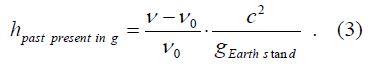 Where hpast present in g is the unknown distance between two points of a gravitational field, (ν-νο)/νο= 3.141592653 is the redshift of the Earth as a component of the highly redshifted Milky Way Galaxy. The c is the speed of light (2.99792458·108 m·s-1) [10] and g is the standard gravity of the Earth (9.80665 m·s-2) [11].
