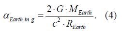 The deviation angle of a light beam (αEarth in g) passing near to a celestial body’s surface (in this case that of the Earth) is, according to Einstein’s formula [7].