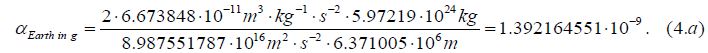 The deviation angle (αEarth in g) of a light beam, which passes near a celestial body’s surface according to Einstein’s formula, is α = 2×G×M×c-2×R-1. Therefore: