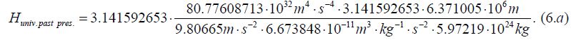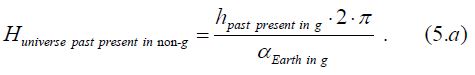 Where, Huniverse past present in non-g is the radius of the universe, (ν-νo)/νo = 3.141592653 is the redshift of the Earth (as a component of the highly redshifted Milky Way Galaxy), c is the speed of light (2.99792458·108 m·s-1), π is the ratio of a circle’s circumference to its diameter (3.141592653). G is the gravitational constant (6.673848·10-11 m3·kg-1·s-2) [10], R is the volumetric mean radius of the Earth (6.371005·106 m), g is the standard gravity of the Earth (9.80665 m·s-2). M is the mass of the Earth (5.97219·1024 kg) [11] and α’Earth in non-g is the vertically opposite angle of αEarth in g (the two angles to be equal in the classical geometric sense).