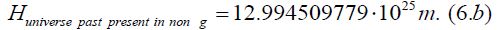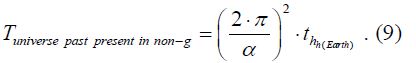 Which, in time (Tuniverse past present in non-g = Huniverse past present in non-g/c) is 4.3345010∙1017s. Since one tropical/solar year is 3.1556926∙107 s [14], this equates to 13.7355010 billion years (≈ 13.7355 billion years) according to our present knowledge [15]. As a check, since 1 light year equals 9.4605284∙1015 m (x=c∙t1tropical year), the radius of the cosmos in light-years is as follows: