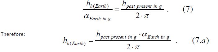 Similar to the above idea, looking for the validity of symmetry towards smaller units of concentric spheres in geometry, a mathematical approach with the following pair of ratios can be given. The ‘short evolving distance’ (hpast present in g) (Eq.3) can be provided by the ratio of the deviating angle (αEarth in g) of a light beam passing near the Earth’s surface as a result of the gravitational field (g) and of the entire plane angle (2∙π) [12].