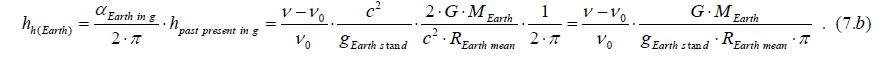 Where hh(Earth in g) is the radius of the Earth, (ν-νo)/νo is the ratio of redshift of the Milky Way Galaxy (including the Earth). The c is the speed of light (2.99792458·108 m·s-1), G is the gravitational constant (6.673848·10-11 m3·kg-1·s-2), M is the mass of the Earth (5.97219·1024 kg), g is the standard gravity of the Earth (9.80665m·s-2), π is 3.141592 and R is the volumetric mean radius of the Earth (6.371005·106 m). (The parameter references are the same as in Equation 6.)