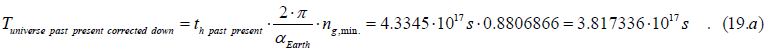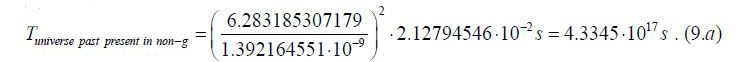 Since th past present is equal to 0.960395021∙108 s (hpast present/c) according to Formula 3.a, the age of the cosmos (Tuniverse past present) is as follows: