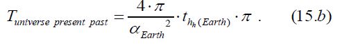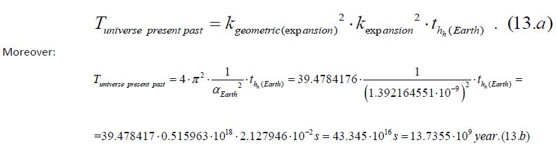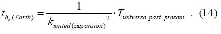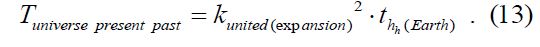 If we want to match the time intervals in the combined equation, we can combine the proportionality factor between them and create a united expansion constant (kunited(expansion) = 2∙π/α or 2∙π∙α-1). (Which can also be called the age determining correlation constant of the universe.) This constant gives a directionality to the dimensional component associated with it in the equation. This direction in this case, when the constant is located next to the radius of the Earth and increases it to an extreme degree, points from the present to the past. Since k is used twice in this case, its square /kunited(expansion)2 = (2∙π/α)2 = 4∙π2/α2 or 4∙π2∙α-2/ must be taken. The age of the cosmos (Tuniverse present past), derived from ‘Earth radius time’ (thh(Earth)), is as follows: