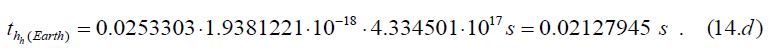 The time derived from the short evolving distance can be called ‘short evolving time’. Time resulting from the radius of the Earth can be defined as ‘Earth radius time’. Since the former (th past present) is 0.960395021∙108 s, the exact time of the latter (thh(Earth)) is as follows: