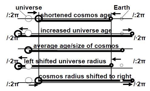 Conversely, when we multiply the age of the Earth by 2∙π, we get the size of the entire universe (visible and invisible part) in light years (Huniverse total (diameter) in light years). This mathematical approach arising from symmetry, due to the departure from the original formula (Eq.12.c) is like looking at the cosmos physically from the outside. This is because the multiplication by 2∙π is not originally included in the definition of the time-dimension (one more multiplication by 2∙π). Later, however, when dividing by π on both sides of the equation, we can look at the entire system from the inside. We then simply divide the radius (age) of the cosmos by π to determine the age of the Earth's formation and vice versa. Multiplying the radius of the cosmos by 2∙π increases the distance (age) in this proportion.