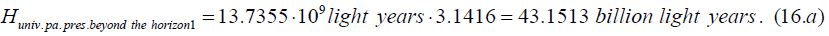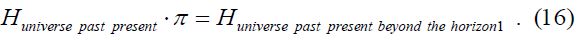 However, for symmetrical reasons, it is necessary to examine what happens if we do not divide Equation 12.c, but multiply it by π. In this case, we exit the combined Einstein formula for determining the radius and age of the universe. Even if we multiply by π the maximum value determined by the formula, which in this sense can be considered as a boundary surface (in 3D as a volume), crossing the limit of the equation we get to an unknown area, which can be named Huniverse past present beyond the horizon1. This is: