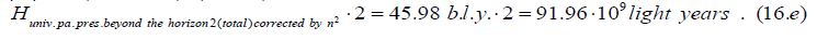 However, if we multiply this by 2, the dimension (diameter) of the cosmos reaches a distance of almost 92 billion light-years named Huniverse past present beyond the horizon2 (total) corrected by n2: