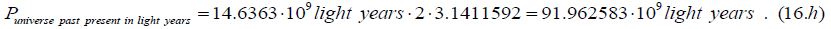 / Another correlation is that by multiplying the original age of the universe in light years (corrected by the gravitational refractive index, n2 = 1.06558) by 2∙π, we obtain a distance of 91.9626 billion light years (14.6363 billion light years · 6.283185), i.e. the total size (the perimeter) of the cosmos. /