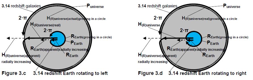 Figure 3.e In this figure, it can be observed that the Earth and the cosmos with a redshift of 3.14 can move in opposite directions in either direction, or even rotate parallel to each other. These alternative motions may correspond to different values obtained for the size of the universe or the radius of the Earth. These movements can add up or just subtract from each other (subsections 6.1.f and 6.2.d).