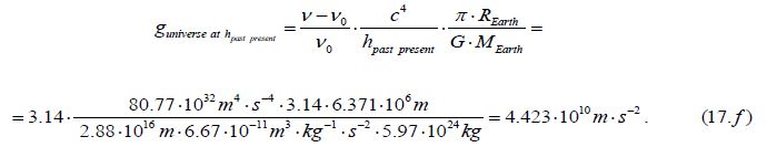 If the same extent of a light beam’s redshift measured at farther galaxies [8] is equated to the acceleration of the Earth (as a component of our galaxy) the above formula may also be applied. (Ignoring the rotation of the Solar System compared to the center of the Milky Way /v ≈ 2.3∙105 m∙s-1 / and the Earth's orbit around the Sun /v ≈ 3∙104 m∙s-1/ in this situation. This is because their magnitude cannot be compared to the expansion of space between distant galaxies [9] that reach the speed of light.) In this manner, a distance (h) can be calculated pointing towards the origin of the universe. This ‘short evolving distance’ (hpast present in g) from a physical point of view is: