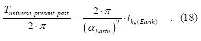 Starting from the short evolving distance (hpast present in g), moving upwards towards the larger distance values (Huniverse past present in non-g) and going downwards the smaller radius (hh(Earth)), the radii of the cosmos and the Earth can be determined symmetrically (Eq.6 and Eq.7). It is necessary to use the α/2∙π-1 ratio to get from the smaller distance value to the one in the middle direction. Moreover, to reach the immense distance directly from the small one, the ratio should be used squared (α/2∙π-1)2. The same relationship applies to time intervals as to the fourth dimension of space-time, which can be transformed into each other according to general relativity. Therefore, if the time interval (thh(Earth)) in Equation 7 is multiplied by (2∙π/α-1)2, it could determine the age of the universe (Tuniverse past present in non-g):