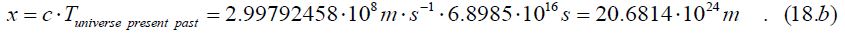Since one tropical/solar year is 365.242189 days long or 3.1556926∙107s, this value (Eq.10.b) equates to 13.7355 billion years. It is equal to the result of the method for determining the radius and age of the universe in Equation 6.