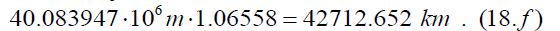 In the case of Equation 12.c, after a huge reduction in space in proportion to the angles, by multiplying both sides of the equation by the components in the equation (2, π, 4, 2∙π, π2, 4∙π, 2∙π2 or 4∙π2 and α/2∙π-1), we obtain oversized Earth radii. In conjunction with formula 12.c, extending the above line of reasoning and if we examine all possibilities (2, 3.1415, 4, 6.2832, 9.8696, 12.5663, 19.7392 and 39.4784) and use the distance values defined by them, the following intervals can be surveyed for the perimeter of the Earth.