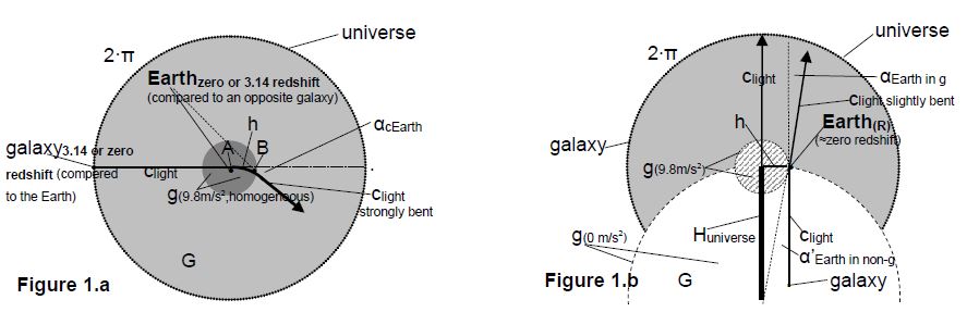 Figure 1. Dualistic Earth (in terms of movement) The relationship between the entire plane angle (2∙π) and the deviation angle of a light beam (c) coming from the galaxy on the left grazing the Earth (αEarth) is illustrated above. (The expanding universe is represented as a light gray circle and the Earth in the center as a black dot.) If the same beam passes through the gravitational field of the Earth (g = 9.8m∙s-2) while the Earth is in motion (n·αEarth) (Fig.1.a) or is comparatively static (αEarth) (Fig.1.b), then the degrees of change in the properties of light (e.g. deflection) are different. In the left-hand figure, compared to the opposite galaxy (with a redshift of 3.14 for example) the Earth moves away from A to B with the same velocity, together with the light beam in its g, along their contact distance hpast present in g. This relative one-dimensional movement of the galaxy and the Earth in three dimensions forms a sphere with the radius of hpast present in g (the dark gray circle) around the planet. Because of the Earth's movement with various redshifts, this sphere also contains a homogeneous gravitational field with a value of 9.8 m∙s-2. During the generation of the contact distance (hpast present in g = n∙REarth) there will exist a concentric relationship between the increasing radius of the universe and the size of the Earth. From this data (hpast present, 2∙π and αEarth), based on Euclidean geometry, the size of the universe (Huniverse past present in non-g) (right hand figure) in the case of the inverse ratio of angles (α/2∙π-1) as well as the Earth's radius (REarth) can be determined symmetrically. (The striped circle in Fig.1.b occupies the same space as in Fig.1.a).