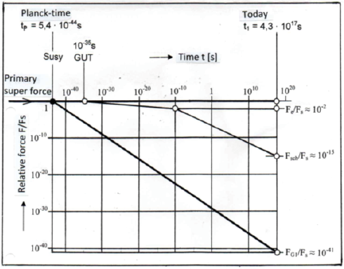 The <Cosmic Time Hypothesis> (CTH) follows a completely different path. It assumes a time-variable gravitational force, which leads to the fact that at Planck time (tp ≈ 10-43 seconds after the Big Bang), this force was exactly as large as the strong nuclear force. This is consistent with supersymmetry (SUSY), according to which all natural forces (including the gravitational force) were united in a single superforce at Planck time. The link between the gravitational force and the strong nuclear force also suggests itself because there is a special relationship between the two. Brian Green has already pointed this out, namely [1] " ...that the gravitational force and the strong force have very different properties, but that they have a similar function: Both are necessary for the universe to exhibit certain symmetries. The same applies to the weak and electromagnetic force. Their existence is also tied to certain gauge symmetries."