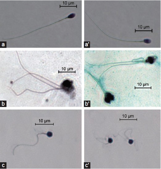 Figure 6. Microscopic Images of Different Types of Sperm Cells with Macrozoospermia Syndrome in Different Staining Modes