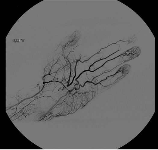 In the second procedure catheter directed thrombolysis was initiated with tissue plasminogen activator. After 14 hours of lytic therapy the patient returned to the operating room for discontinuation of lytic therapy and percutaneous transluminal angioplasty of the PMA at the level of carpal tunnel. Completion angiogram as shown in Figure 2. Post operatively his hand was pink and warm, motor and sensory were grossly intact and had no signs of ischemia. He was discharged home in stable condition. Five days later he was seen by the plastic surgeon for numbness and tingling of the left hand. After discussions with the vascular surgeon the cause of the patient’s symptoms was surmised to be from chronic compression at the carpal tunnel and would benefit from CTR. The next day the patient underwent a CTR that showed a grossly normal median nerve. Unfortunately, the carpal tunnel was not further explored and the persistent median artery was not searched for during this procedure. The patient was seen by the vascular clinic 18 days after last vascular procedure and plastic surgery clinic 11 days after CTR for postoperative visits at which time he was free of any pain or color changes to the left hand or digits. Aspirin was continued and he was taken off Clopidogrel. He was to return to the plastic surgery clinic in 6 weeks and to the vascular clinic in 6 months but has not returned the either clinic and has been lost to follow up. Institutional Review Board (IRB) approval was obtained prior to undertaking the any investigations involving the patient and case.