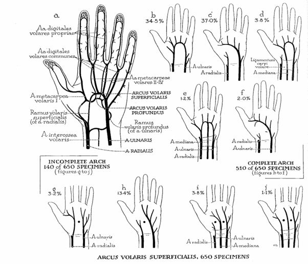 Figure 3. Types of superficial volar arterial arch encountered in 650 dissections [3]