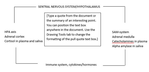 Figure 2. Simplified Illustration of Cooperating Stress Reaction Systems. To the right: The Sympathetic- Adrenal Medullary System (SAM). Fast working Effects by the Catecholamines Adrenaline and Noradrenaline in Blood. Increases Alpha Amylase in Saliva. To the left: The Hypothalamus - Pituitary- Adrenocortical axis (HPA). Increases Cortisol in Blood and Saliva. More Slow and Lasting Action. Under: The Stress Reactions are impacted by Cytokine and Peptide Hormones of the Immune System. The Connection line indicates that the three Stress Reaction Systems Communicate and Interact
